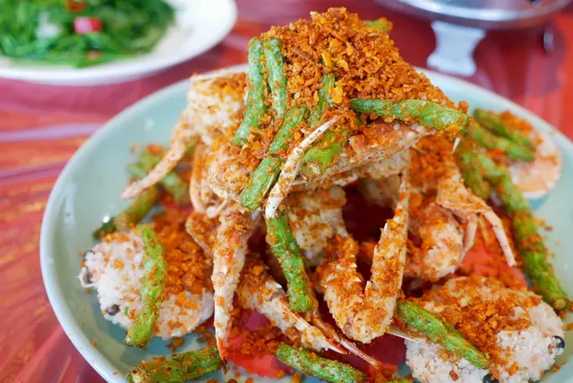 炸過的螃蟹塊拌炒避風塘,每一口都能吃到濃郁的蒜香味!螃蟹的肉質非常鮮甜,搭配酥脆的外皮非常美味,比較小的蟹腳可以酥到可以直接咬了吃下