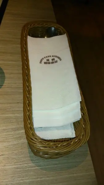 桌上已放餐具及紙巾,整齊的擺放在籃內