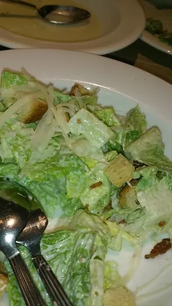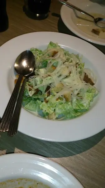 凱薩沙拉:這邊的沙拉很特別的是上頭還撒上起司,而且份量還給的不少,裡面除了青脆的青菜外,還多了脆脆的麵包丁及硬硬的培根丁,在口感上很豐富。