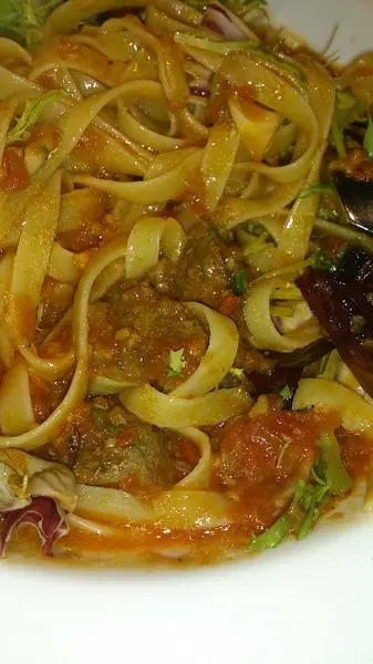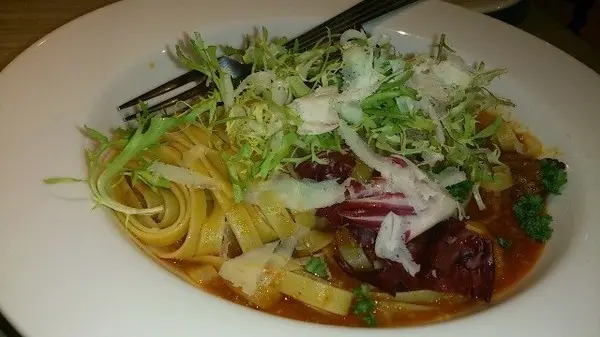 (極推!!)烤牛肉丸子茄汁寬扁麵:擺盤非常漂亮,有紫紅、綠色及黃色的麵條,在視覺上看起來很可口。