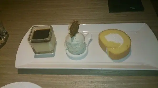 雙人甜點拼盤1份:這一盤裡共有三種,分別是鮮奶卷、手工冰淇淋及咖啡布丁。