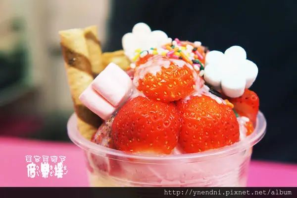 上面除了有可愛的棉花糖、巧克力米和脆笛酥之外,最吸睛的就是新鮮草莓哦~