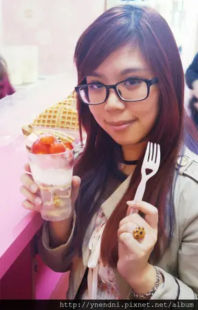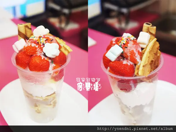 最近主打草莓季節,所以一整個芭比粉紅色的草莓鬆餅很吸引人的招手呢~~