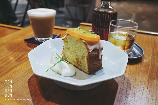 這磅蛋糕切得很厚, 還附了一片糖漬柳橙和鮮奶油,