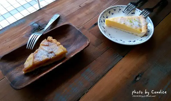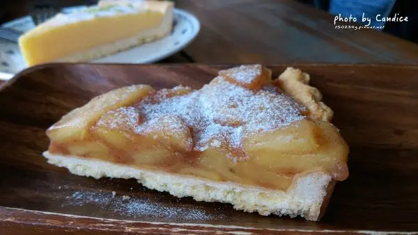在選蛋糕的時候我們就有詢問老闆蘋果派內有沒有放肉桂,老闆就說「有阿還放很多哈哈!!」,Joyce本身很愛肉桂就馬上點來吃了,雖然我平常真的是拒肉桂於千里之外,但吃甜點時總是避不了的,蘋果跟肉桂幾乎無時無刻都會一起出現呀,嗜甜的蘋果派是屬於法式的普羅旺斯蘋果派,沒有美式蘋果派那上層網狀的酥皮,跟滿是蘋果醬的內餡,法式蘋果派純粹就是蘋果們跟派(一起擦出的火花??),派皮烤的非常酥,也不會油膩,又很薄,很厚的派皮整個會讓我吃到想發瘋,會覺得太膩,上層滿滿的蘋果餡,它們應該有跟肉桂還有蜜糖燉煮後才一起放上來烤的,蘋果跟肉桂的味道都很明顯,非常成功!!