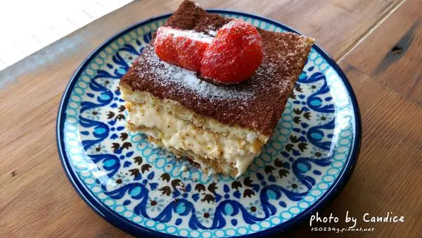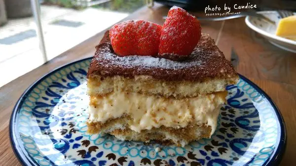 能吃到提拉米蘇真的很幸運(因為老闆不常做哈哈!),上面還放了顆當季的新鮮草莓(發願!好希望老闆出草莓蛋糕),嗜甜的提拉米蘇老闆是使用義大利的食譜去做改良,其實正宗的提拉米蘇,吃起來就如同很火紅的泥巴派一般,中間的馬斯卡彭起司Mascarpone,是有點介於優格與生乳酪之間的,因此它其實應該要撐不太住蛋糕,點提拉米蘇老闆會從冷凍庫拿給你! 手指餅乾浸在espresso中溫潤的口感,可可粉跟espresso微微的苦味都被夾心的起司中和掉了,這塊真的很好吃,但是強烈不建議外帶,你因為當你長途跋涉到目的地,終於準備要打開紙袋開心想用它時,你會發現!它們!真的!!變成!!一坨!!泥巴派了!!!