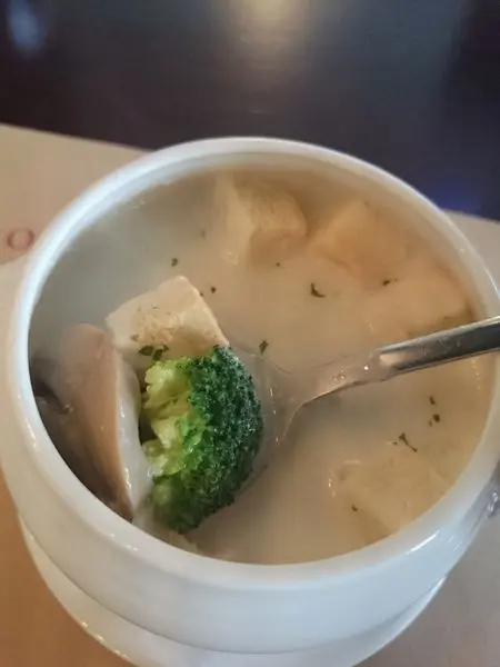 大朵菇類與花椰菜浮沉其中,濃湯口感也很溫順,缺點是喝完這一盅湯,肚子已經半飽了!