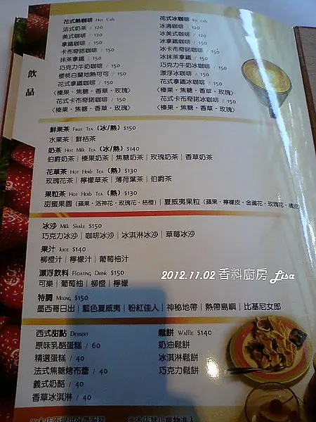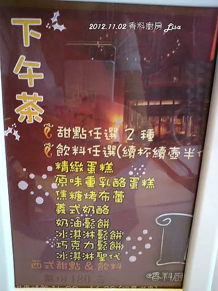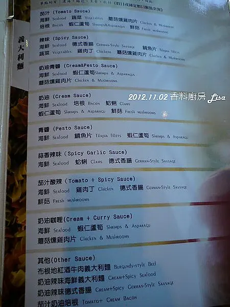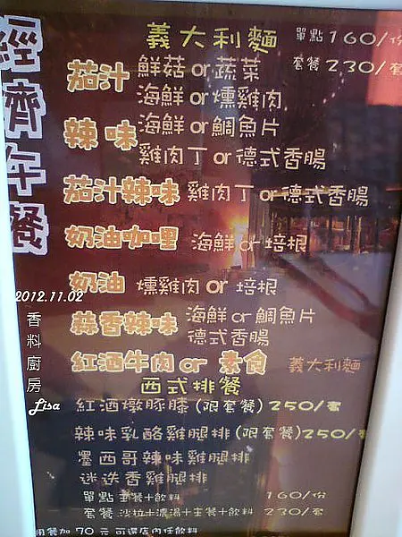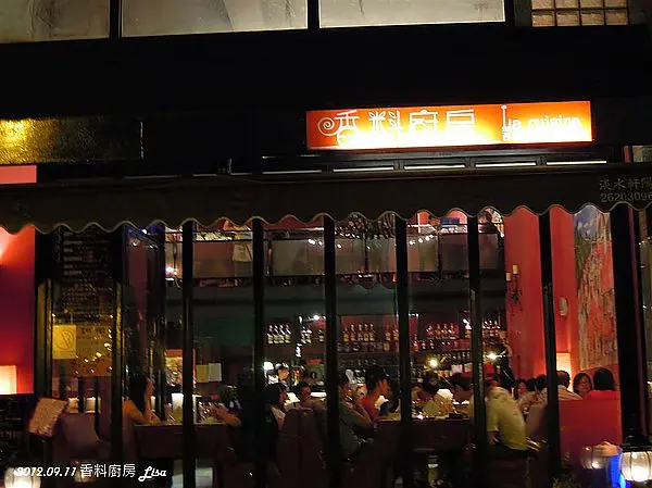 香料廚房在老街靠近尾巴的地方,應該是在台電的對面附近(憑印象是這樣)。晚上看起來很有情調;也很熱門,雖然有兩層樓但很容易就客滿了。第一次去的時候很幸運(每天都自我催眠自己是強運少女),我跟友人剛好有一桌可以坐而且是在一樓!喜歡在一樓的原因是因為挑高比較無壓迫感。