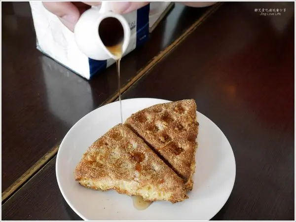 淋上楓糖口感更是絕佳,熱熱吃鬆餅還會有布丁蛋糕的口感,可惜靜兒拍照拍太久了,