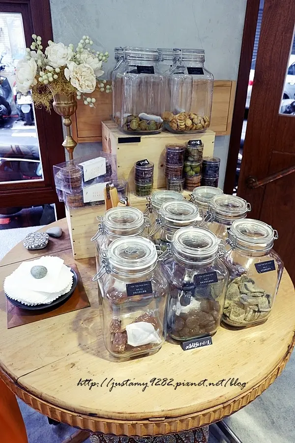 門口旁擺放了各式各樣的餅乾、零食罐