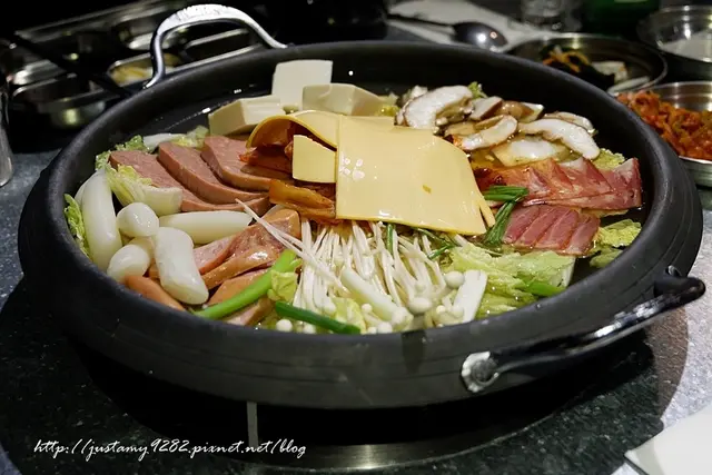 大腸、豬皮、部隊鍋、煎餅澤一 (海鮮煎餅、起司泡菜煎餅、馬鈴薯煎餅3擇1,我們點海鮮煎餅)、泡菜肉彈、冷拌麵