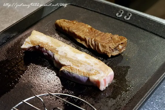 看她純熟的在烤盤上烘烤五花肉&豬大腸