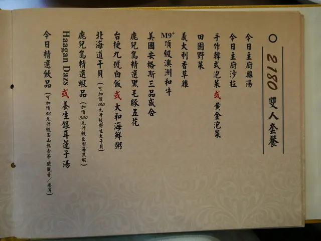 主要有香草雞、澳洲和牛、安格斯三品盛合、黑毛豚五花、干貝和蝦品以及其他配餐和飲料