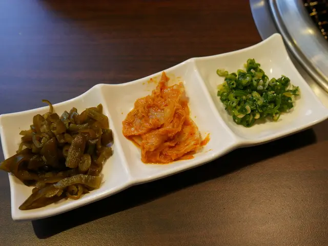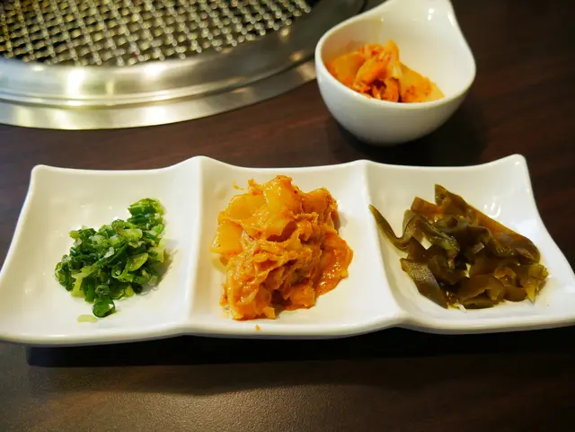 首先上桌的是小菜,由左至右分別是蔥末、黃金泡菜和剝皮辣椒