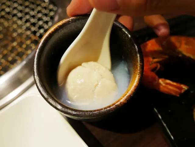 店員在幫我們代烤時,就說她很喜歡他們家的海鮮湯(干貝底部的湯)