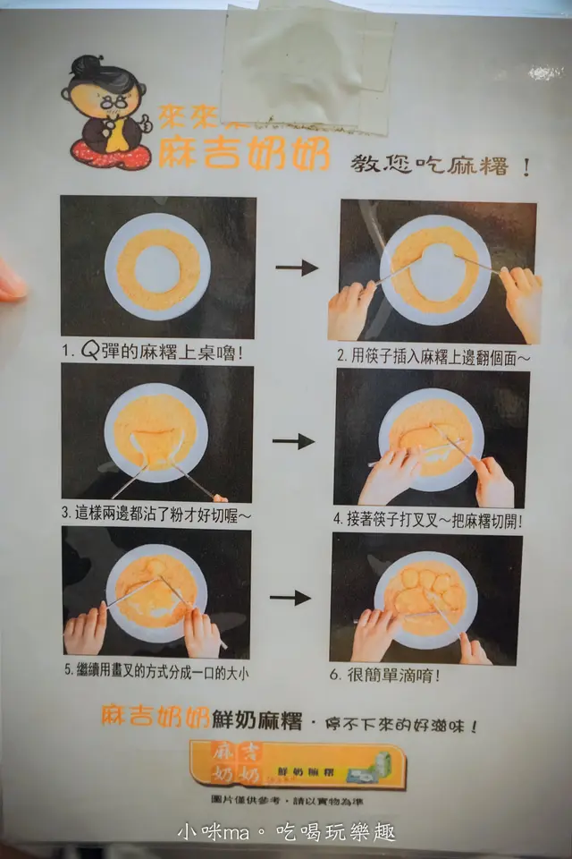 貼在牆壁上的菜單翻過來就是食用方式,它們家的鮮奶麻糬真很滑嫩,食用前先用筷子把鮮奶麻糬分成一小塊、一小塊,站著旁邊的配料就可以享用啦
