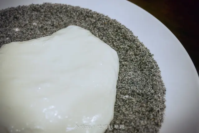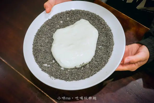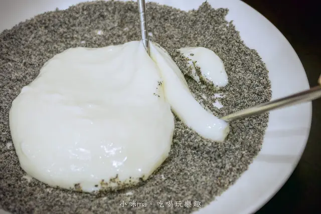 一小塊都可以裹滿芝麻粉,他的鮮奶麻糬吃起來又滑又軟,是真的不像傳統麻糬的口感,奶味很濃跟芝麻粉的香很搭,剛開始吃會不習慣,哈哈,但吃久了也挺順口的