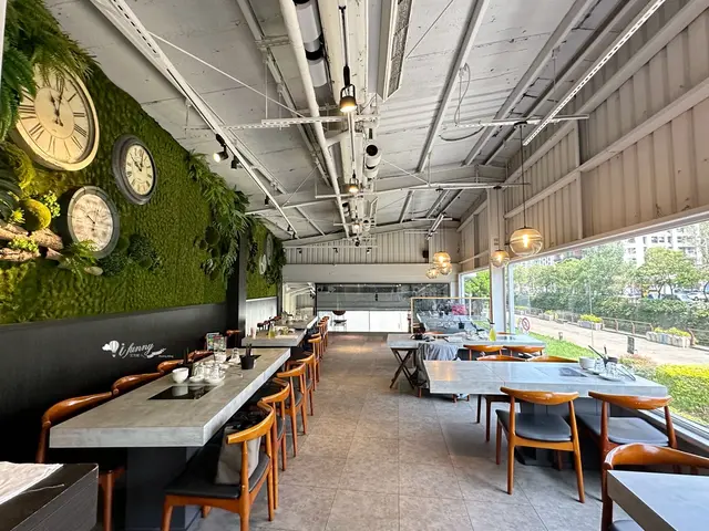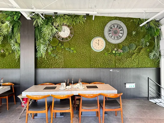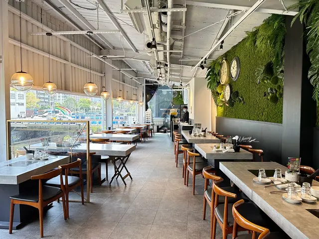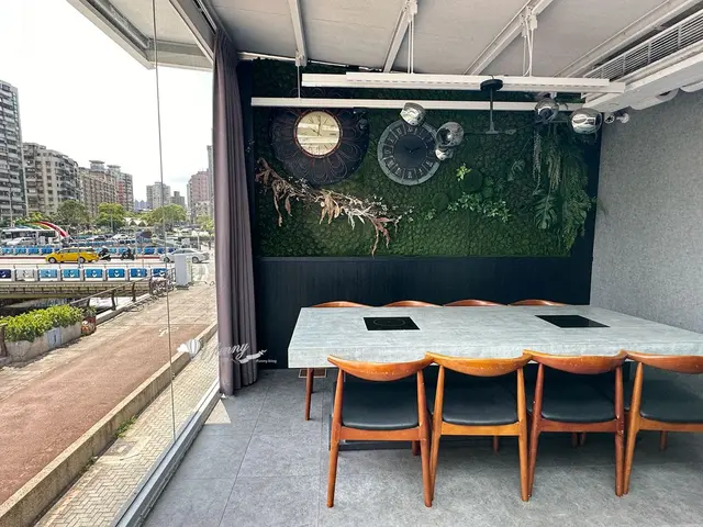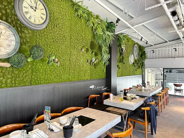 走到二樓後,就是面對中港大排的大片窗景,牆面滿滿綠色植栽,搭配原木桌椅,散發出森林般的清新氣息,引進大量的自然光,空間顯得寬敞舒適。