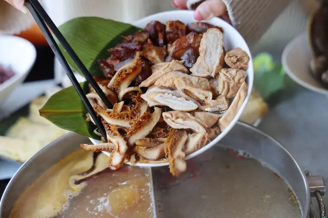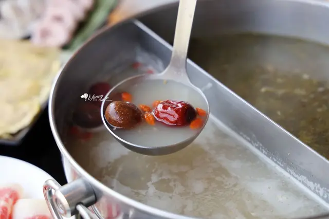 養生百味鍋呈現的是濃郁的湯頭,有著香醇中藥清香,滑順不膩口,涮肉或海鮮都很適合。