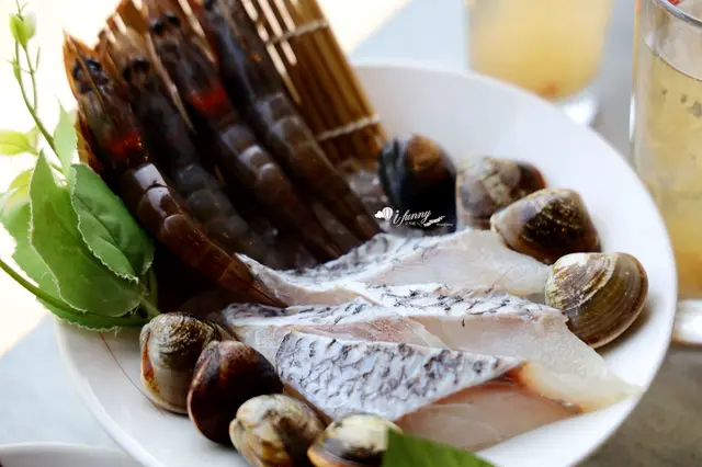 海鮮拼盤裡有鮮蝦、鱸魚以及蛤蜊。