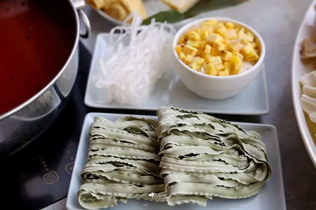 這天我們點的是四人套餐,包含了鍋底、綜合蔬菜盤一份、兩種特製沾醬、附餐選四、肉品選二、海鮮拼盤、花枝漿、餃品拼盤、非基改豆品拼盤、季節飲品四杯。
