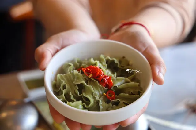 最喜歡手工蕾絲麵,老饕建議吃法是淋上辣油湯底,再拌入一點蔬菜醬,嗜辣者再加上點生辣椒,只能說銷魂啊!