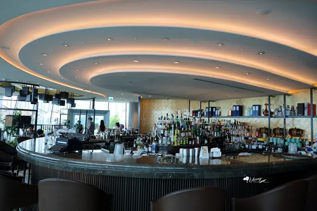這個以金箔壁面裝飾的中島吧檯加上天花板的圓弧設計及燈光的配置,造就出一個炫麗奪目的大酒吧!