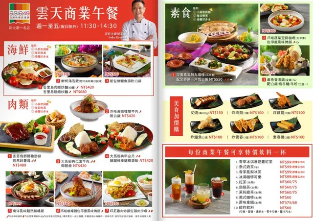 新北最高餐酒館「Asia49亞洲料理及酒廊」,以日夜變幻的無邊美景和膾炙人口的南洋佳餚,網路好評不斷。餐廳新聘印尼主廚胡英達Indra Kusuma到任,近期以改版的「商業午餐」讓來客嚐鮮,週一至五(假日除外)11:30至14:30以套餐的型態供應,售價NT$299起,一律附贈每日例湯、香蘭珍多冰、以及小菜吃到飽。新主廚的廚藝高超,餐點滋味相當美味!另外還有午茶調酒放題,恣意享受微醺午后時光。