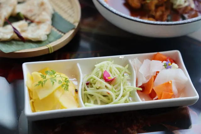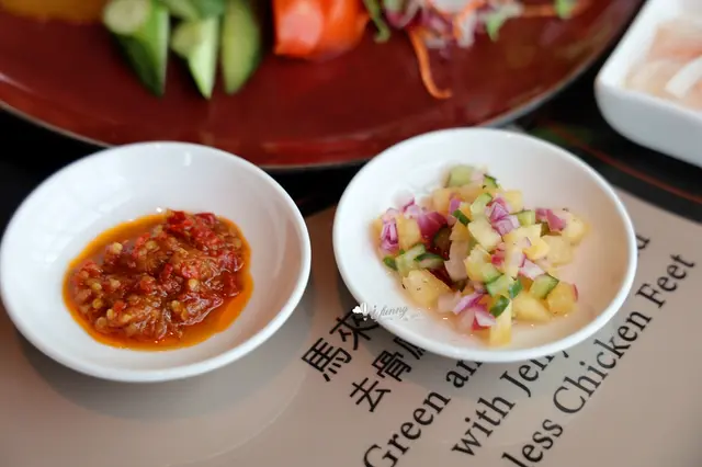 無限供應的小菜吃到飽,主廚也會以季節食材變化陣容,誠意十足。這天我們吃到的百香果青木瓜片,清爽開胃。