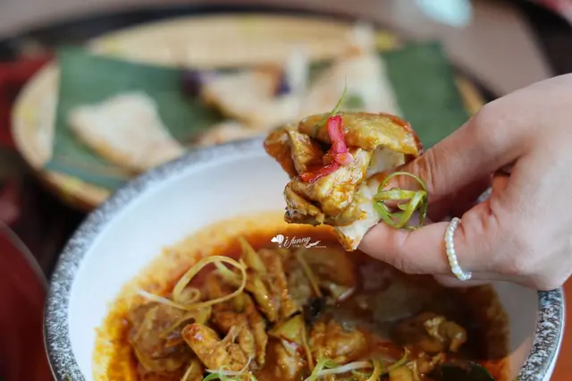 這道料理先炒香融合了大蒜、咖哩葉…的綜合香料泥,便加入雞腿、檸檬葉、辣椒、香茅和椰漿…等,煮濃收汁而成,一上桌就香氣撩人鼻息。