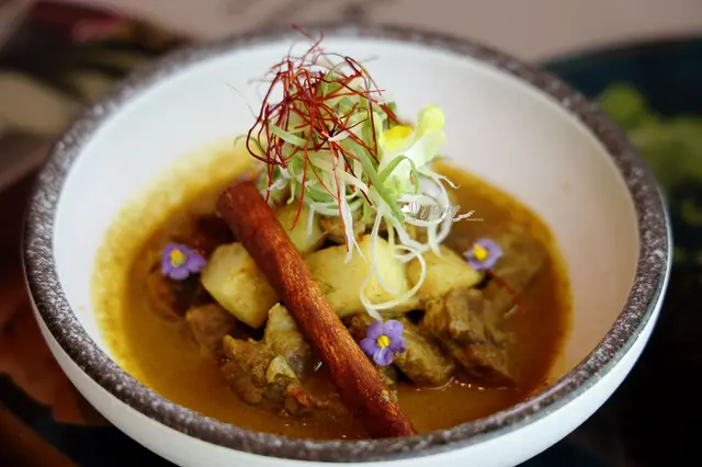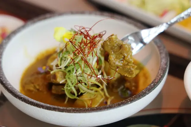 這道菜的牛腩先用南薑、月桂葉烹煮去腥,才加到融合了薑黃、干蔥、檸檬葉和辣椒醬的綜合香料中,再加椰糖、椰漿、牛高湯,小火慢燉到軟嫩入味,湯色橘艷,牛肉微辣噴香,讓人胃口大開!