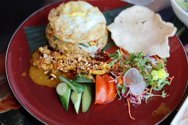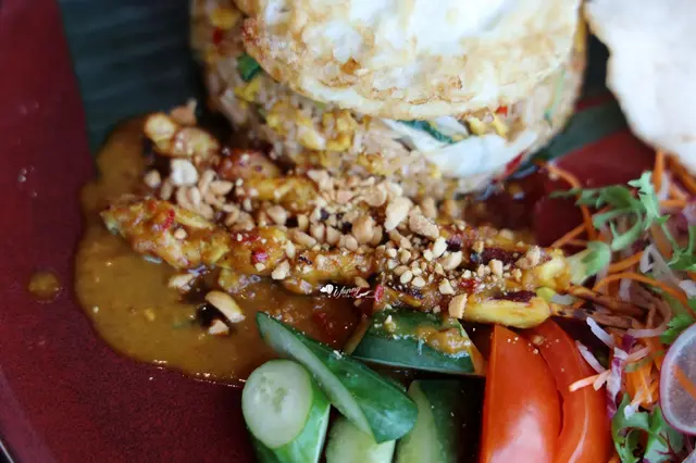 印尼炒飯種類千變萬化,但配料多以雞肉為主,加入以大蒜、干蔥、辣椒打碎的香料泥和靈魂調料–印尼甜醬油炒成,盛盤後會搭配沙嗲(雞、牛、羊皆可)、蝦餅、煎蛋、生菜一起食用。
