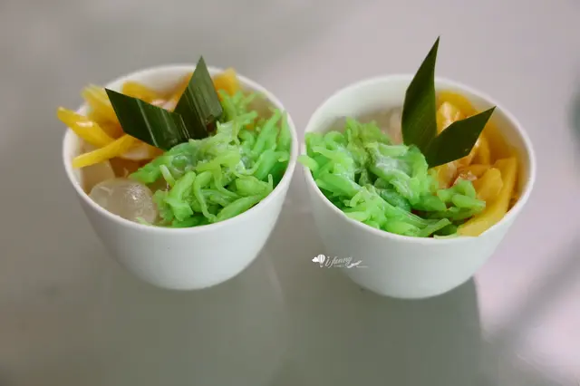 這是隨餐附贈的香蘭珍多冰,源自印尼爪哇卻風行於東南亞的知名冰品,主廚以香蘭葉汁與糯米粉做成綠色粉條,標配椰漿與椰糖,外加波羅蜜和亞答子,原汁原味,香甜盈口!