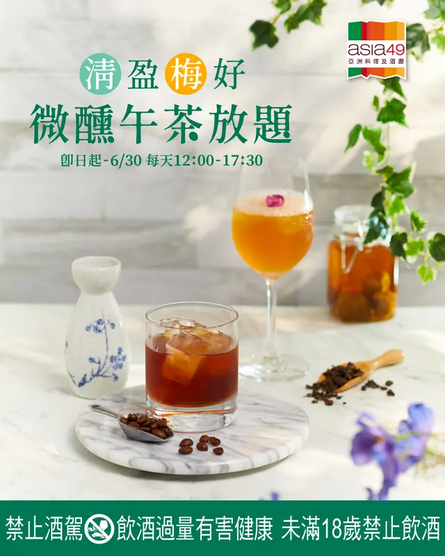 新北最高餐酒館Asia49「午茶調酒放題」即日起登場,以酒感較低的清酒、梅酒為主角,取清酒的甘冽、梅酒的酸甜,結合茶香、咖啡香,推出6款特調。每人NT$599+10%即可暢飲90分鐘,盡情享受微醺午后時光。