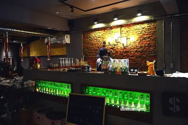 巧妙地運用了韓國燒酒綠色瓶子的顏色,在燈光的折射下散發出綠色的光線,和吧台後面的紅色磚牆成了強烈的對比,視覺上很有衝擊感!