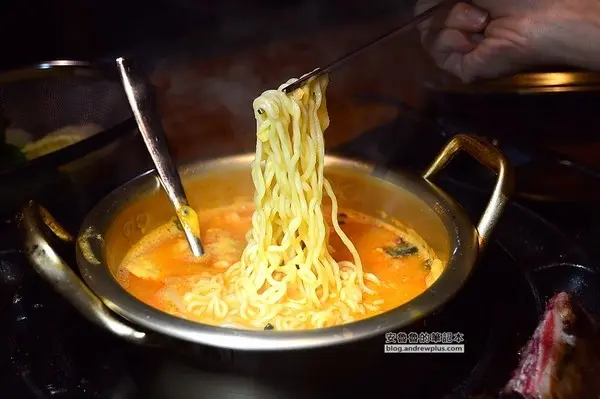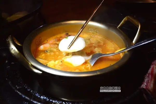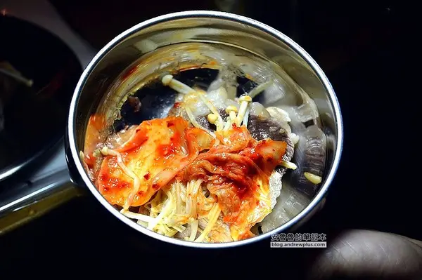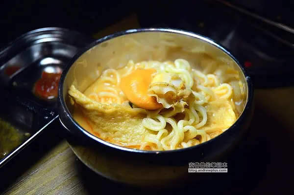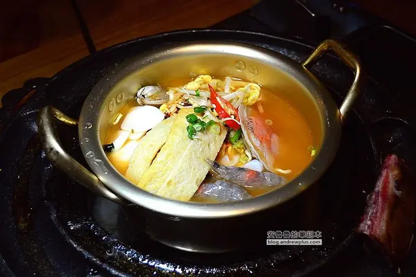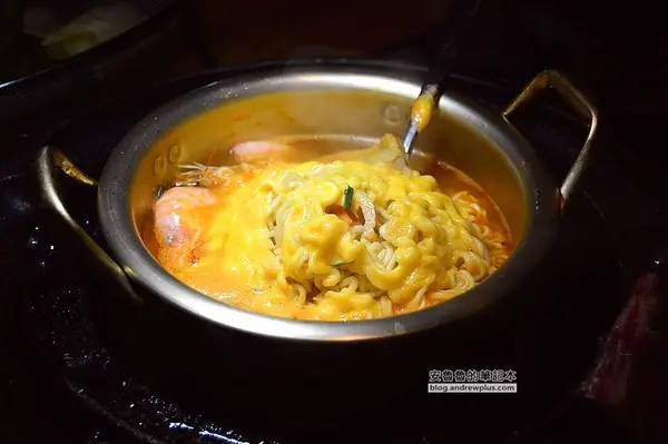 連鍋子都選用充滿韓國味的銅鍋,派上久煮不怕爛的韓國泡麵當主角,加入生辣椒提高辣度,還有蛤蜊、花枝、海帶、年糕、黑輪、蝦子、扇貝、豆芽、紅蘿蔔等豐富食材,最後再加上起司片