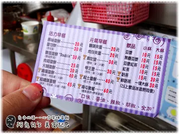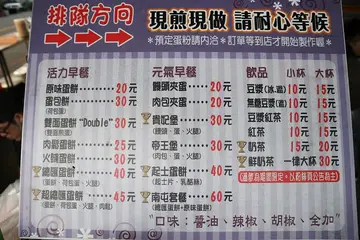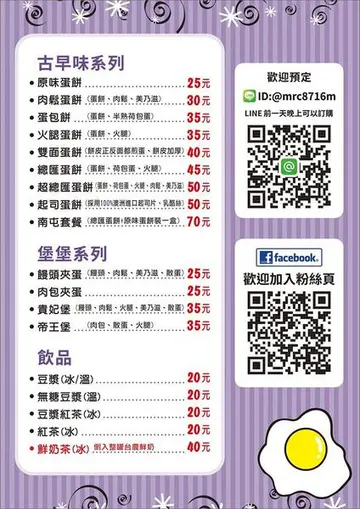 原味蛋餅 / 荷包蛋 / 蛋包餅 / 無糖豆漿 / 貴妃堡 / 超級總匯蛋餅 / 豬排蛋餅 / 總匯蛋餅 豆漿 / 九層塔蛋餅 / 火腿蛋餅 / 肉鬆蛋餅 / 雙面蛋餅 豆漿 / 雙面蛋餅 起司 / 雙蛋蛋餅 / 饅頭夾蛋 / 雙面蛋餅 / 帝王堡 / 豆漿紅茶