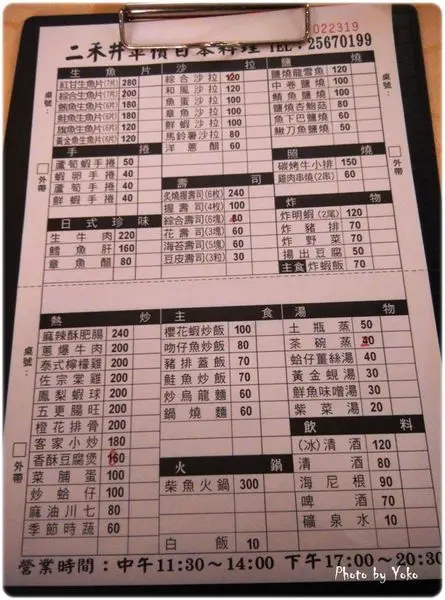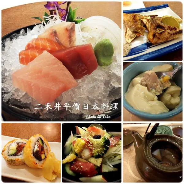好吧!我知道我的標題下的有點機車,好康都過了才來發文分享,但是這也算是一種個人生活的紀錄呀!而且真的還算平價,所以且看我娓娓道來吧~!【二禾井平價日本料理】在台中大雅已經開很久了,因為家裡每天都開伙,所以我一樣是沒吃過~這次好像是開幕八周年慶吧,所以經過店門口便可看見許多祝賀花盆,因為看見外面貼了紅色的告示,周年慶的這段期間有部分菜色半價,所以本來沒打算吃的,雙腳就莫名其妙的自動走了進去。店門外面有一桌桌椅,感覺夏天晚上很適合坐在這邊吃點日式料理,喝點清酒。店內的位置大約可容納30幾人吧!大部分為小矮桌椅,另外也有幾桌圓桌,如果是小家庭聚會的話也蠻適合的。MENU既然是日本料理店,基本的日式料理都有的,另外還有提供一些中式熱炒,如果是人多的聚餐就比較適合點熱炒來一起吃。牆上還有貼上個人套餐的菜單,只有兩個套餐可以選擇。當下便拿【廟東壽司屋】那間的價錢來比較…東西雖然有差,但是覺得這個價錢超便宜的啦!因此便點了B套餐來嘗嘗看~另外再加點一些單點。----------以下便是B套餐的內容 NT.380/人-----------魚刺身第一道就是生魚片,上菜速度其實還蠻快的。生魚片只有三塊不同的魚,厚度還算可以,新鮮度也還OK,不過量有點少,吃的不是很過癮。泰式檸檬雞這道是炸雞去做泰式檸檬口味,只能說炸物做成這個口味真的還蠻搭的~吃起來一點也不膩口,單吃或是配飯吃都很適合。鹽燒魚下巴最期待的就是這道菜了,不過因為是個人套餐,所以真的好小塊啊……!!好吃是好吃,但是根本吃不夠>口<季節時蔬 就是炒青菜囉!我覺得有點過於鹹。花壽司 一共有兩塊,這算是主食了,做的還不錯吃。和風沙拉這裡的出菜順序有點奇怪,沙拉應該會比較早上桌,沒想到是到最後兩道才出現,也許是因為一次製作的關係吧?!生菜新鮮脆口,微微酸甜的和風醬很開胃(雖然已經吃飽了)土瓶蒸 這壺土瓶蒸裡面料還蠻多的!有魚有蝦有蛤蠣,香菇、筍片等等,湯頭喝起來清甜可口,不錯!------------接下來就是單點料理的部分-------綜合生魚片 NT.200這天單點的部分都是週年慶半價優惠,但是我仍是標上了原價。一共有四種魚類、八片生魚片,裝盤還挺講究的,用了許多冰塊,所以可以慢慢吃沒關係。茶碗蒸 NT.40裡面料還蠻多的,有魚肉、蛤、香菇、玉米等等,吃起來口味適中,吃完一個也飽了一半~ 綜合壽司(6塊) NT.80雖然是很一般的壽司,但是半價優惠真的很划算,六個只要40元!口感還不賴~而且吃完之後超飽的!有點後悔沒多點一份!結論這間日本料理店提供的餐點選擇還蠻多的,熱炒、火鍋都有,而且也有單人套餐,價錢算是挺平價的,口味也還不錯,不管是散客用餐或是多人團聚都非常適合來此用餐。二禾井平價日本料理電 話:04-2567-0199地 址:台中市大雅區雅環路二段104號營業時間:週一至週日 11:30~14:00,17:00~21:30…查看更多