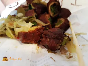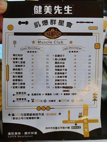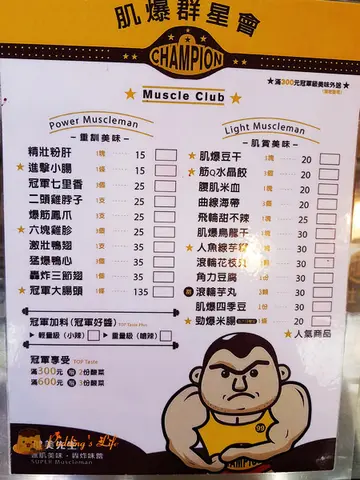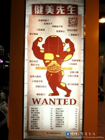 一中是布丁念書時最愛逛的地方之一即便現在不住台中仍三不五時會回去晃兩圈亮黃色店面的「健美先生」是最近新開的炸滷味想吃滷味又想吃炸物很難抉擇嗎健美先生的激炸滷味兩個願望一次滿足「健美先生激炸滷味」位於一中光南對面門口精壯的公仔很是吸引路人目光才開業沒多久食尚玩家和旅行應援團就來介紹不知是否因為前身是一中老字號滷味的緣故菜色及數量標示一清二楚不怕付錢時大吃一驚櫃位前食材分門別類排放很整齊想吃什麼可以一目了然食材看來新鮮有光澤不像有些店是從冷凍庫中冰很久才退冰的每個菜色都有和健美先生相關的有趣名稱像是人魚線芋粿.六塊雞胗.二頭雞脖子等哈...真的是很好笑耶食材們大都事先用醬汁滷過等到顧客上門時再現炸出餐塞滿青蔥的冠軍大腸頭是人氣必點商品大腸頭的作法常會在東山鴨頭店看到都是先滷製後再油炸只是兩者吃起來的味道完全不同東山鴨頭的醬汁有著甜甜的焦糖味這裡的則是搭配酸菜一起吃大腸圈裡的青蔥仍保有翠綠其他還點了進擊小腸.筋Q水晶餃.腹肌米血.曲線海帶比較特別的是水晶餃有層油Q外皮海帶就是純滷應該沒有炸啦激炸滷味感覺上比單炸或單滷來得費工不少有時候如果剛好嘴饞想要滷味炸物通吃可以考慮來「健美先生」一次包辦健美先生激炸滷味地址:台中市北區太平路99號電話:04-2229-2279時間:12:00~22:00 創作者介紹 棉花糖布丁 Pudding's Life…查看更多