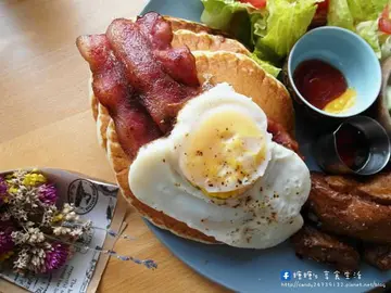 嗝 gé是一間可愛又文青的老宅咖啡店,同時也是一間寵物友善餐廳提供早午餐、輕食沙拉、飯食及下午茶,還有提供狗狗的鮮食料理店裡頭有兩隻超可愛的店狗,法鬥犬皮皮跟巴哥犬皮蛋,兩隻狗狗都很活潑跟客人互動哦​提醒大家可以跟他們玩沒有關係,但不要抱牠們或給他們餵食唷嗝 gé位於忠勤街上,隱身在一個寧靜的社區中,以老宅改建而成招牌其實不太顯眼,看到小小的白色燈箱,上頭有一隻狗狗打嗝的圖案就是囉店裡頭的裝潢依舊保留了老宅原有的樣貌,簡單大方,沒有過多花俏的擺飾空間寬敞舒適,讓人有一種回到家的溫馨感​兩隻店狗都超可愛,是說他們好厲害,可以上一秒活潑的跑來跑去,下一秒就倒地睡著了內用每人低消是90元,早午餐系列供應時間為09:00-14:00,飯食為11:00-14:00下午茶為14:00後供應,輕食及沙拉的部分則是全天供應,這裡也有提供狗狗鮮食唷 嗝 gé最重要的小事,請大家一定要好好遵守哦早午餐附上的紅茶,用了量杯裝,底下還有木頭杯墊,讓平凡的紅茶瞬間變得有好質感甜度還OK,不會太甜,喝起來還蠻順口的美式培根蛋鬆餅 230元 早午餐系列均附新鮮生菜沙拉、水果及薯塊,看起來還蠻豐富的生菜沙拉的部分原本是附上店家自製的油醋醬,因糖糖本身不太喜歡吃油醋醬所以改成胡麻醬,生菜口感清脆,裡頭還添加了些許堅果,搭配胡麻醬一起吃好清爽​水果都是採當季新鮮水果,糖糖這天來吃到的是蘋果、芭樂及柳橙馬鈴薯塊是用炸的,上頭撒上些許鹽巴提味,外脆內綿,還不錯吃,可惜偏油了些培根煎的脆脆硬硬的,香氣十足吃起來不會很油膩,一旁荷包蛋本來是請店家弄半熟的可是上桌時是全熟的,讓糖糖有點小失望美式鬆餅口感軟綿,其中一片煎的焦焦的,吃起來帶有微微的焦香,糖糖好喜歡旁邊還有附上蜂蜜,可以依喜好自行添加番茄莫札瑞拉鹹派 240元 另外這款番茄莫札瑞拉鹹派是蛋奶素,裡頭只有番茄、莫札瑞拉起司及羅勒,沒有肉肉哦旁邊一樣附上新鮮生菜沙拉、當季水果及薯塊鹹派的派皮還蠻酥的,不會到很油膩,整體吃起來番茄偏重,起司的香氣沒有很明顯說早午餐份量還算豐富,口味上還OK,糖糖很喜歡他們家的用餐環境很舒服又自在,還有兩隻店狗狗陪伴玩耍,也可以帶自己的毛寶貝們來玩唷查看更多