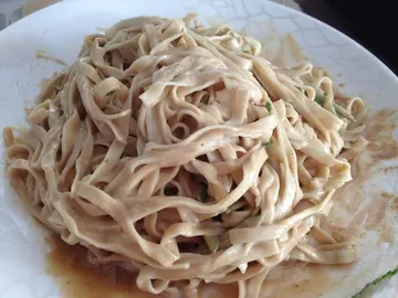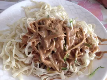 雖然已經入秋了有時中午的天氣還是熱到嚇死人..這麼炎熱的天氣當然要來碗冰冰涼涼的涼麵消暑囉 今天要來跟大家推薦這家位於向上市場裡的嘉義阡涼麵它可是有很多報章雜誌報導過唷外帶涼麵可選擇原味、芥茉、蒜味、辣味的內用的話調味料都可自己加除了美味的涼麵外 還有乾隆豆乾、味增湯及皮蛋豆腐涼麵的大小都是秤重的唷我們點大碗的看起來還蠻大一盤的 這邊還有免費的決明子茶可以喝唷 內用的調味醬芥茉醬味道還蠻重的但不會很嗆辣蒜泥醬搭配涼麵別有一番風味唷辣味醬丸先生說還蠻辣的怕辣的人請勿嘗試唷【涼麵 - 大】45元他們家涼麵的麵條跟外面的不樣是用白麵下去做的口感比較沒有一般涼麵來的有嚼勁不過可以吃到淡淡的麵香 他們家的醬汁是用芝麻醬加上美乃滋口味比較偏甜一點Q彈的麵條在搭配他們家的獨家醬汁整個超絕配 丸先生超愛他們家的醬汁吃完了隔天還吵著要來吃呢 下次要來吃看看他們家的乾隆豆乾 嘉義阡涼麵04-2302-5768台中市西區公正路189號(中美街口)08:30~18:00…查看更多