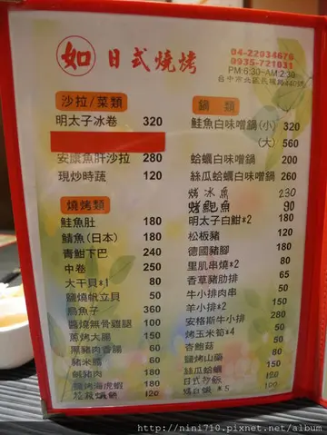 【如日式燒烤】位於台中市北區民權路上,鄰近國立自然科學博物館,是一間深夜不知道去處可以選擇的小店,這次跟友人相約這裡品嚐一下這間小店的滋味到底如何,就讓我們品嚐下去吧!▲店面外觀其實不算明顯 【如日式燒烤】店家用餐環境頗有濃濃的日式風格,外觀由木頭搭建的小亭子,有分室外用餐區域還有室內用餐區域,室內很有包廂的感覺,店內餐點有分為海味烤物、燒烤類、串燒、蔬菜烤物、湯品、炒類與冷盤。▲店內用餐環境▲店內菜單▲店家招待醬菜還蠻開胃清脆爽口▲日式鯖魚炒飯炒飯搭配上面的海苔絲,果然很日式風格,口味方面也很特別 ,飯粒粒粒分明,越吃越刷嘴。▲紐約客牛肉串與醬燒雞肉串牛肉串不會老而且嫩,醬燒醬汁口感也鹹到恰到好處,雞肉串也很嫩。▲花枝蝦餅很有零食的口感一片接著一片的品嚐。▲鹽烤山藥山藥經過鹽烤後相當的清脆而且甜度都有出來,吃一口還會牽絲,搭配店家的些許鹽巴,滋味真的還蠻美味的。▲鯖魚烤得恰到好處,魚皮很酥脆魚肉又很入味。▲醬燒無骨雞腿推薦的一道,醬燒真的很誘人搭配肉汁這樣的鮮嫩多汁,吃了一口真的接著一口。▲軟絲最後再來一個軟絲,海鮮烤味真的是一個不錯的選擇。 ▲鮭魚白味噌湯宵夜當然不能錯過就是來一碗熱熱的味噌湯,小碗的份量就已經足夠四個人份,老闆真的好大心。 【如日式燒烤】可以說是一間很精緻的深夜小店,簡單的日式風格搭配海鮮烤物與串燒,想要吃到飽還可點湯與炒飯,真的是一間很適合深夜無處去的三五好友相約來聚聚的好地方。…查看更多