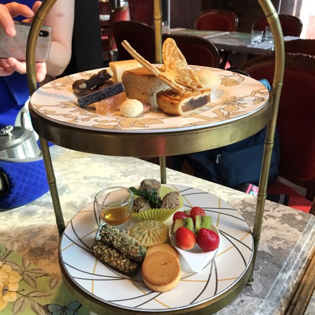 我們是在下午去的,兩點半以後菜單會更換,改提供下午茶。因此就出現了之前從未看過的新菜色,真是開心~我點了一個「冰淇淋佛跳牆」,這一甕並不大,比我想像中的要小了一些~據店員說法是裡頭有10來種配料,跟樓下冰淇淋幾乎是用同種配料,肉眼觀察有起士蛋糕、焦糖香蕉、巧克力海綿蛋糕、綠茶圓(?)、蓮子、奇異果、哈密瓜、蛋白餅,相當豐富。冰淇淋的口味是固定的,好像是水果搭配茶,一個吃起來像紅心芭樂、一個是鐵觀音之類,當時很餓沒有好好聽介紹...但這兩種冰淇淋都很好吃,只是融化的速度還蠻快的~要趕緊吃!荔枝冰淇淋搭伯爵戚風佐葡萄蘭姆酒汁(超長的名稱),上桌超美~比佛跳牆美多了!戚風蛋糕超好吃,尤其是上面的鮮奶油,非常的清新自然啊,一點都不厚重,感覺吃了也不會胖(畢竟是奶油吃了是會胖的喔...),荔枝冰淇淋很「荔枝」。整體來說,戚風蛋糕的分量很多,足足有兩大塊,但是價格偏高,這樣一份要320元。水果也很好吃,至於葡萄藍姆酒汁?沒有什麼感想,有或沒有這個醬汁好像都沒差...半夢半醒之間奶茶,維持一貫的茶香馥郁,甜度自調。忘記是幾號的鳳梨茶,家母選了那幾款中口感較偏酸的鳳梨茶,可是喝起來還是很甜...她覺得跟豐原廟東夜市的鳳梨冰有點像,只是鳳梨果肉多很多這樣...吃到一半,服務生開始逐桌發送小禮物(?),每人一根法式水果軟糖,有鳳梨和百香果兩種口味,但是服務生介紹錯,把鳳梨和百香果的顏色搞混,害我吃到鳳梨...這個法式水果軟糖樓下也有賣,滋味很不錯,酸得很過癮而且非常夠味,小小一口就可以吃很久,整個嘴裡面滿盈水果的滋味。…查看更多
