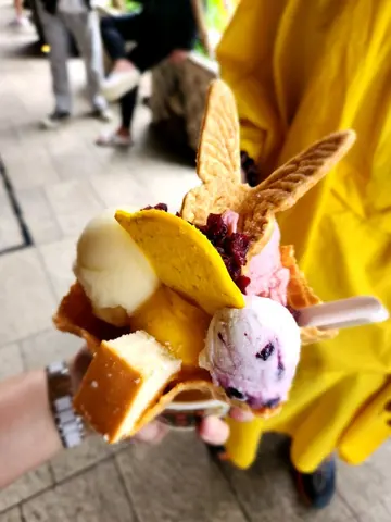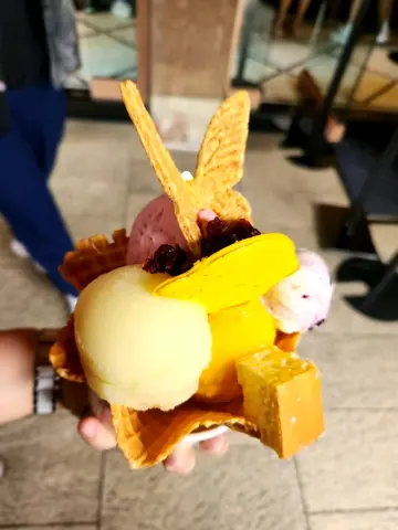 行過而個景點,見好多人係間雪糕店排隊。上網查先知原來咁出名本身叫2球雪糕,但因學生優惠,結果又送多一球,超開心❤️雪糕口味超多,我真揀唔落手,結果揀了上網多人推的口味——龍眼蜜乳酪、九號花生牛奶、巨峰葡萄個人超喜歡乳酪味,滿滿的乳酪味,加上水果味,味道不太甜膩,剛剛好但如果平時喜歡食花生的朋友🥜,相信九號花生牛奶才是你最好的選擇,花生打碎後混入雪糕,滿滿的花生味。雪糕質地像Gelato 結結的。店舖還送2個小食裝飾雪糕——- 選了甜味鳳利酥同乳酪🧀️