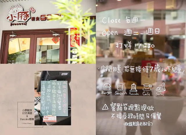 最近台中燒起厚鬆餅的風暴,但是講到台中的日式厚鬆餅就不能不提元老級小豚輕食了!即使台中餐廳比比皆是,但小豚輕食依舊是我久久就會想吃一下的台中餐廳(蔬菜沙拉和厚鬆餅真的是太美味啦)!無論你是綿密舒芙蕾愛好者,還是扎實厚鬆餅的鐵粉,或者是台中早午餐的尋覓者我都推薦你一嚐台中小豚輕食日式厚鬆餅! 巷弄裡的小豚超高人氣的日式鬆餅店離台中景點文學館只有四分鐘車程離人氣景點草悟道也只要五分鐘車距的小豚輕食 雖然鬧中取靜了一個巷弄的位置但無論是做為台中一日遊的行程之一還是做為朋友聚餐、情侶約會的餐廳都是很方便安排行程的地理位置!吃過這麼多的台中厚鬆餅 小豚輕食厚鬆餅不只用料實在還會跟著季節推出季節限定口味這次再訪就是衝著我懷念以久的夏季限定檸檬愛玉口味啦!現在還有IG打卡兌換500元折價卷的活動!不過大家要注意的是小豚輕食不接待7歲以下小朋友所以家長們可以注意一下!盤聚著轉角的小豚輕食有著很明亮寬敞的用餐空間小豚輕食不走排場、不做華麗裝飾簡約桌椅呼應日式風格的那份拘謹但是活潑的配色讓這個空間也兼具了親切感還有時不時出現的小豬仔更是空間裡的小確幸!小豚輕食的餐點因為都是現點現做所以會需要一段等待時間即使如此,從廚房傳來的陣陣飄香還有零星的鍋碗瓢盆撞擊聲讓這等待時間充滿了一波波的劇情一點都不無聊呢!小豚輕食的用餐方式採半自助式茶水和餐具記得要自取唷! 小豚菜單!夏季冬季都會改版!小豚輕食的低消是一人一份餐點或是每人消費250元小豚輕食冬夏都會改版一次菜單而最近推出的夏季菜單多了午間限定餐食!小豚輕食的價格單點大概都是200元出頭還可以加80元升級套餐多一份濃湯和麵包小豚輕食的漢堡也是大受好評大家也可以試試!(雖然我都是來吃厚鬆餅的