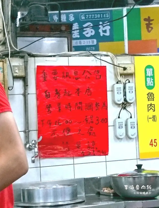 超過60年台中第二市場深夜食堂魯肉飯老字號《李海魯肉飯》,開晚上的李海跟開早上的山河魯肉飯分別是第二市場的美食門神,新聞上說《李海魯肉飯》已經收攤了,但其實從開業到傳第二代時就分成第二市場店與原子店,是原子店的老闆娘身體不好,第三代也沒有要接,所以決定停業,第二市場內的60年老店《李海魯肉飯》還是有營業啦!|台中宵夜美食李海魯肉飯之前入住在台中公園智選假日飯店,晚上11點半又騎著Ubike來到離飯店不到5分鐘車程的台中第二市場,半夜裡的第二市場看起來冷清,裡頭卻只有這一家深夜食堂《李海魯肉飯》還是人聲鼎沸,果然是老饕最愛的台中深夜美食,《李海魯肉飯》螢業時間從下午4點到凌晨3點。《李海魯肉飯》只有晚上跟凌晨才有營業,想來吃的朋友可別來錯時間,但也不用怕,白天來就去對面的山河魯肉飯也行,他們兩家就是一種互補的狀況,如果像我這樣子的瘋子才會安排中午吃山河宵夜吃《李海魯肉飯》,轉頭看自己的肚子說這是職業傷害。|第二市場李海魯肉飯菜單價格李海魯肉飯菜單賣的東西也很簡單,就魯肉飯跟肉燥飯兩種,如果加便菜就有便當選擇,隱藏版應該是限量的腳筋飯,我這次沒有點,魯肉飯一碗是70元,再來湯品大多都是豬雜為主的湯品,一碗是45元,特別的是冬粉肉圓湯,李海魯肉飯菜單上的肉圓指的是肉丸啊!再來就是一些便菜,有大小分之分。|第二市場李海魯肉飯推薦必點魯肉飯魯肉飯 NT$60元點餐的時好像沒有看到有三層或腿庫的選怎,我也忘了問,來的時候是腿庫魯肉飯,再講一次在台中魯肉飯就等於是台北的焢肉飯,而台北的魯肉飯就等於台中肉燥飯。山河魯肉飯的配菜是筍干,《李海魯肉飯》則是配上脆瓜,吃起來口味較重一些。《李海魯肉飯》焢肉肥的部份油膩感沒那麼重,吃起來會化開,滷到又香又舒服的口感,瘦肉部份也是很軟嫩,但我覺得比山河魯肉飯來的嚼勁較多一些,辣椒還蠻嗆辣的,酸菜算是很提味,宵夜時段吃完這碗,肚子很滿意。小菜(小) NT$20元會有一些便菜可以選擇,小份是20元大份是40元,價格不會太貴,像我點小份的小黃瓜就這麼一大盤,多人來吃應該可以滿滿一桌。冬粉肉圓湯 NT$30元冬粉肉圓湯這裡的肉圓指的不是我們熟知的彰化肉圓,是台語發音的肉丸,裡頭還有粉絲跟筍子,吃起來還蠻清爽,之前一碗20元,現在雖然漲到30元,還是很便宜啊!蝦仁湯 NT$45元蝦仁湯喝起來微鮮甜,還帶有一點薑絲的味道,一碗45元蝦仁算是也給的很多。越夜越美麗越晚越多人,在凌晨的第二市場裡面唯一燈火通明的一家深夜食堂《李海魯肉飯》,雖然李海魯肉飯原子店已經要收了,可是你還是能到第二市場吃到這50年的味道,魯肉飯上的那塊焢肉滷得夠味也夠軟爛,相較早上場的山河魯肉飯來說,個人覺得李海的味道比較重一些,兩家都不錯吃。…查看更多