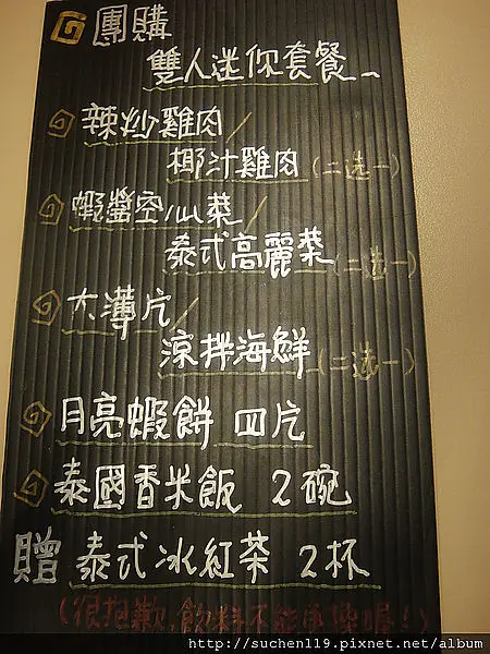 嗜吃酸辣口味的我們敗!!!!!辣炒雞肉/椰汁雞肉(二擇一)+蝦醬空心菜/泰式高麗菜(二擇一)+大薄片/ 涼拌海鮮(二擇一)月亮蝦餅四片+泰國香米飯二碗+泰式冰紅茶二杯看店家菜單才知道各種菜色都有分大小份之分覺得這樣很貼心耶!不然如果只有二三個人來用餐都是大份量的菜的話只能點少少幾樣不能想吃什麼就點什麼!!準備上菜囉!!餐具一定要拍月亮蝦餅看起來就超好吃的!!外酥內軟.....真的一口接一口的很想把它嗑完涼拌海鮮 泰式沾醬夠酸夠辣!! 大薄片本來看到有肥有瘦的肉片怕會油膩...........oh....不出乎意料的肉有點脆脆的而且不油不膩耶!!椰汁雞肉椰奶味很重!!喜歡這種風味的朋友千萬不要錯過!! 辣炒雞肉很下飯的一道菜害我多扒了半碗白飯泰式高麗菜我不明白泰式炒高麗菜是加了什麼就是炒高麗菜但是吃起來味道跟一般我們在炒的味道不同!蝦醬空心菜蝦醬很香還蠻好吃的!!早知道二盤都點空心菜滿滿一桌子的菜為了等檸檬魚來又加點了涼拌青木瓜好吃!!美中不足的是那個荳子也太老了吧!?咬不動!!我直接夾開不吃了!!清蒸檸檬魚超好吃的!!湯汁夠酸夠辣非常夠味阿!!這份檸檬魚特別為阿計加點(她愛吃魚)等了半天一直沒來原來是服務人員漏單了好吧!!看在魚這麼好吃的份上.....我原諒你了下次還要來!!!因為還有很多菜都還沒有吃過有翻拍了店內菜單有興趣的朋友可以把網頁往下拉參考看看囉!! …查看更多
