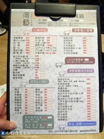 網路大推牛肉火鍋,台中溫體牛火鍋星粉們有沒有跟我一樣,越熱就越想鑽進冷氣很強的火鍋店,好好大吃一頓的怪癖啊🤣這家網路上一片好評的演藝牛鍋,從歐風門口裝潢就好吸引人,店面舒服,冷氣夠強,裝潢有質感,店門前有停車位。用餐空間寬敞,很舒服服務人員也滿客氣的,硬體很優。演藝牛鍋的菜單及價目表價格不算便宜,說真的有點貴。除了牛肉外,還有簡餐跟炒菜,這次吃起來炒菜比較合我們胃口,下次若再訪會考慮吃簡餐配炒菜。醬料自取。火鍋湯頭滿清甜的,不過有點可惜的是,牛肉盤價格頗高但肉香不足,是有軟嫩啦,但就感覺少了什麼⋯不合我們胃口,自然就覺得CP值很低囉😢😢😢下次再造訪應該會考慮簡餐,看隔壁的覺得還不賴,價格也比較實惠,火鍋就不考慮囉,小朋友會哭哭😏私房炒菜很膩害,尤其是牛肝啊啊啊啊怎麼能這麼好吃,香香甜甜有口感,讓我們直呼下次必點😱😍😍查看更多