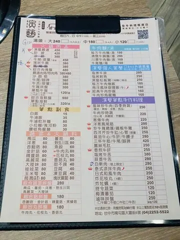 Flank Steak / 牛肉炒飯160 / 牛滷乾拌麵 / 牛滷飯 / 牛燥飯 / 牛鍋 / 牛雜拼盤 / 沙朗筋 / 炒牛雜 / 空心菜炒牛肉 / 炸牡蠣 / 香煎牛肝 / 泰式涼拌牛肉 / 海鮮拼盤 / 秘方牛肉麵 小拉麵 / 秘製牛肉湯麵 / 塊狀牛腩 / 綜合菇拼盤