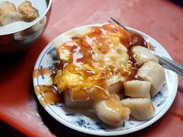台中第二市場中的王家菜頭粿糯米腸,是一家沒有什麼裝潢的店家,而且座位就在騎樓上,但卻總是大排長龍的熱門店家,招牌的蘿蔔糕、糯米腸,再加上一碗湯,幾乎是每桌必點的。另外對面的老賴紅茶,排隊人潮同樣也是不遑多讓,到底這兩家的魅力在哪?來一探究竟吧!.王家菜頭粿糯米腸是艾方妮的口袋名單,自從在美食節目看過介紹後,就一直想來嚐嚐,所以這天第二市場第一攤就是這裡了!其實王家菜頭粿糯米腸在市場中不算是個店家,比較像是一個攤子,座位區是設在騎樓上,幾乎都是得跟別人共桌。我們是一個人去點餐,另一個人去找位置。餐台上就是他們的廚房,有煮鍋及煎台。菜頭粿的用量極大,一旁放著準備隨時下鍋。芋頭糕好像也蠻多人點的。負責煎台的工作人員,幾乎手都是不停歇的。因為客人一直不斷上門,才煎好的餐點馬上就裝盤端走。而且為了消化客人,在騎樓上另設了一個煎台。瞧瞧這個陣仗,就知道生意有多好了!因為這天第二市場我們還有想吃的名單,因此兩個人只點了一份餐及一碗湯。菜頭粿 $30+米腸 $20+煎蛋 $10=$60其上淋的是醬油及一點點甜辣醬,吃來鹹鹹甜甜的。不過把蛋撥開後,可以發現無論是蘿蔔糕、蛋及米腸,顏色都很白,感覺沒有煎得赤赤的,有點小失望。可能是艾方妮從小吃大的高記,因為採高溫油炸,所以邊角都是酥脆的,對於入口很軟的蘿蔔糕及米腸就覺得沒那麼討喜了!但醬料很古早味,所以搭起來還是覺得不錯!有沒有覺得高記這炸過的金黃色澤,再加上蒜末,實在太令人垂涎了呢?另外王家菜頭粿糯米腸這價錢跟高記比起來,也沒那麼可愛。不過煎及炸的料理方式不同,也不好比較了!甜不辣湯 $25這說是甜不辣,但應該是黑輪。湯頭像是煮關東煮的湯,所以很甜且很清爽,是搭配其他餐點很棒的配角。…查看更多